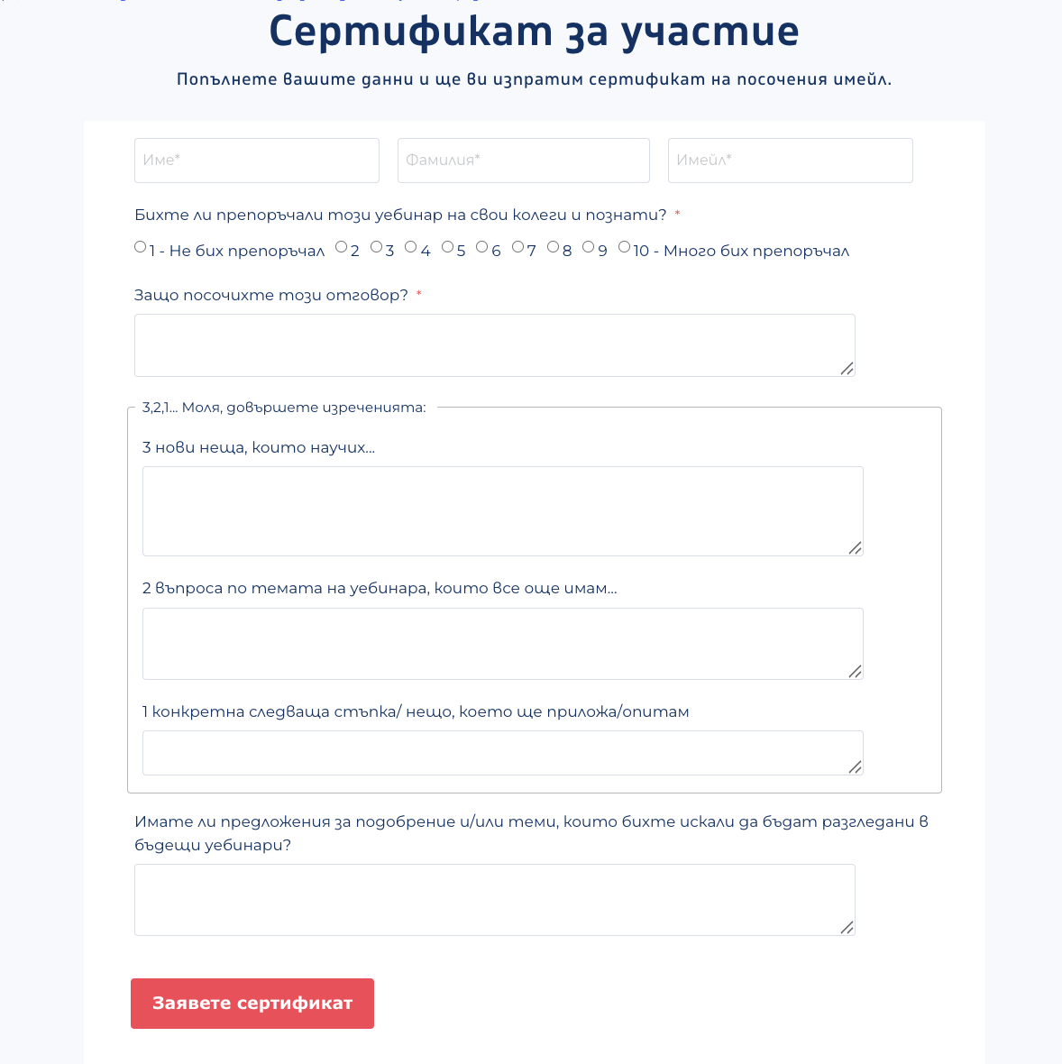 Внимание: Въведете имейла си правилно! Сертификатът ще бъде изпратен автоматично на него.