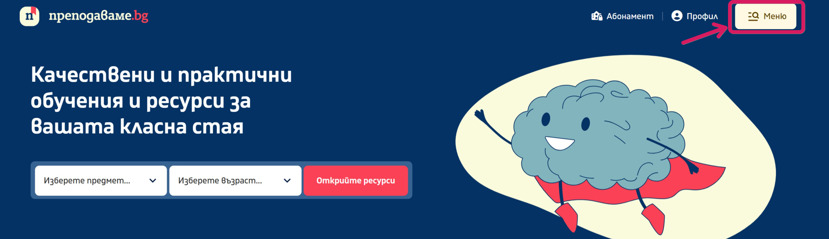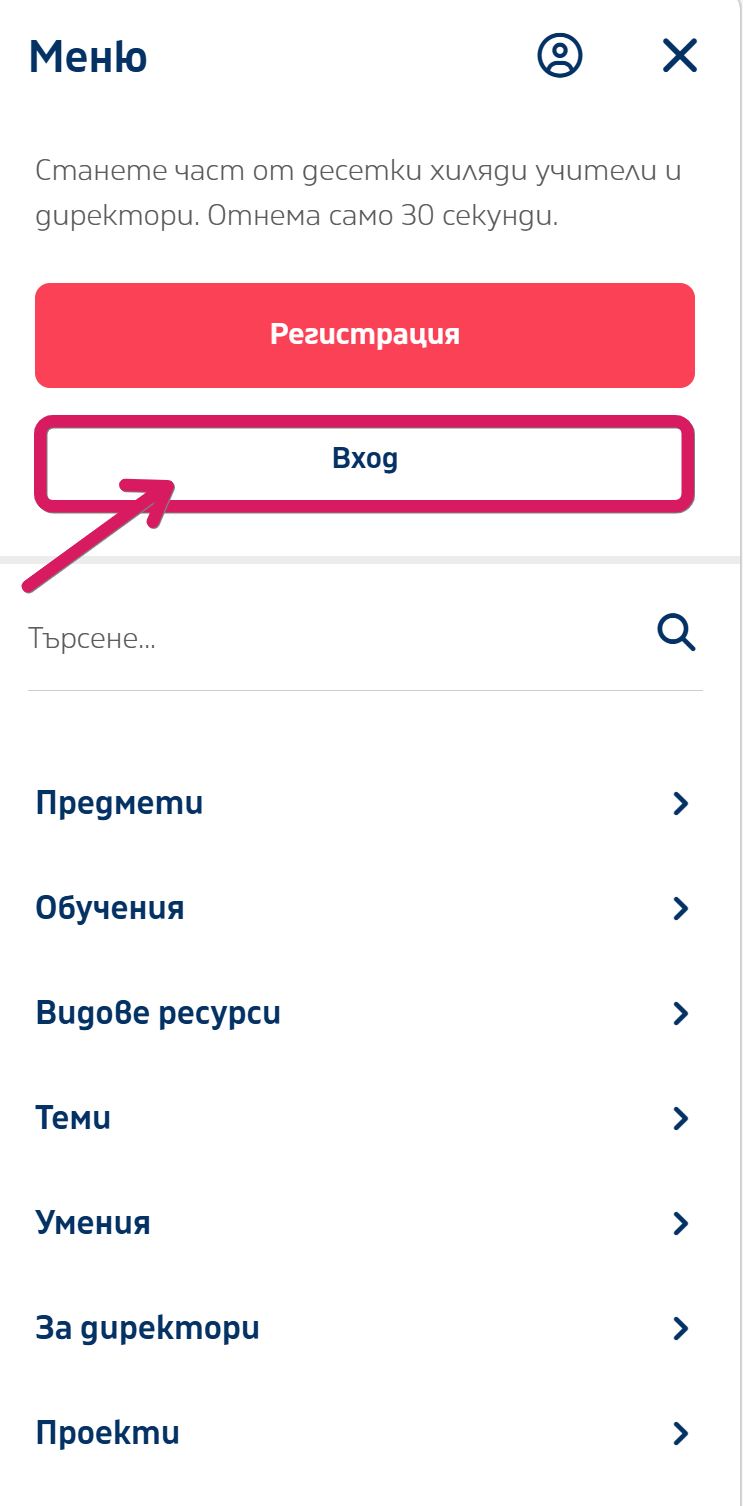 1. Отворете сайта https://prepodavame.bg и натиснете бутона "Меню". След това натиснете върху "Вход".