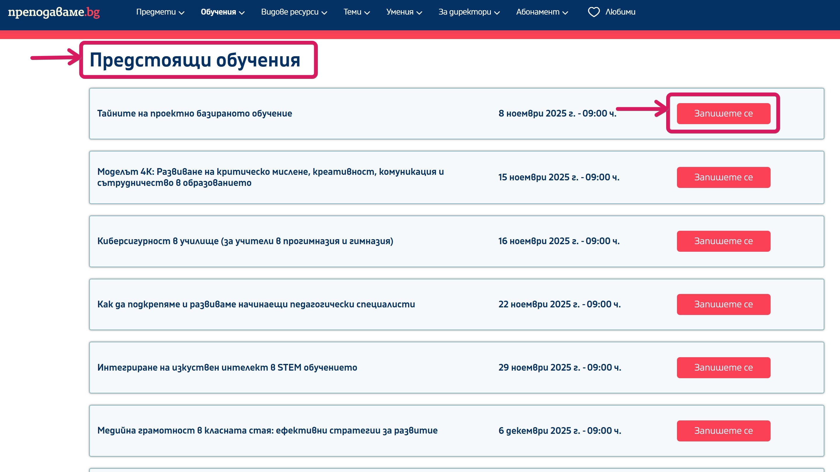 3. От секция "Предстоящи обучения" изберете обучението, което Ви интересува.