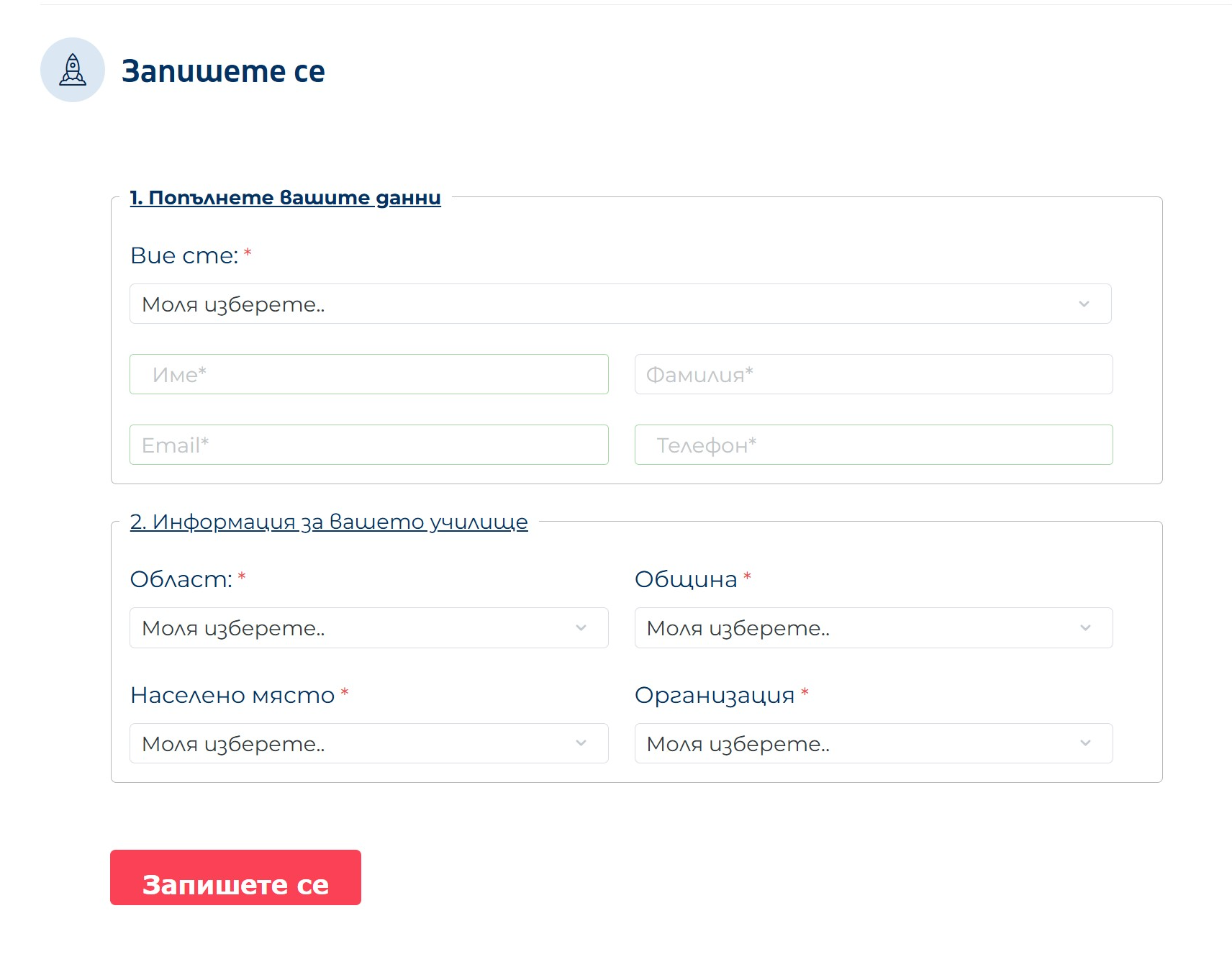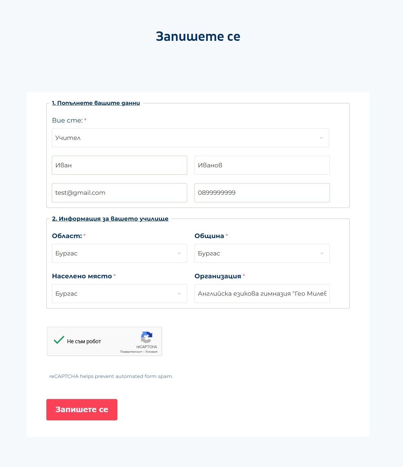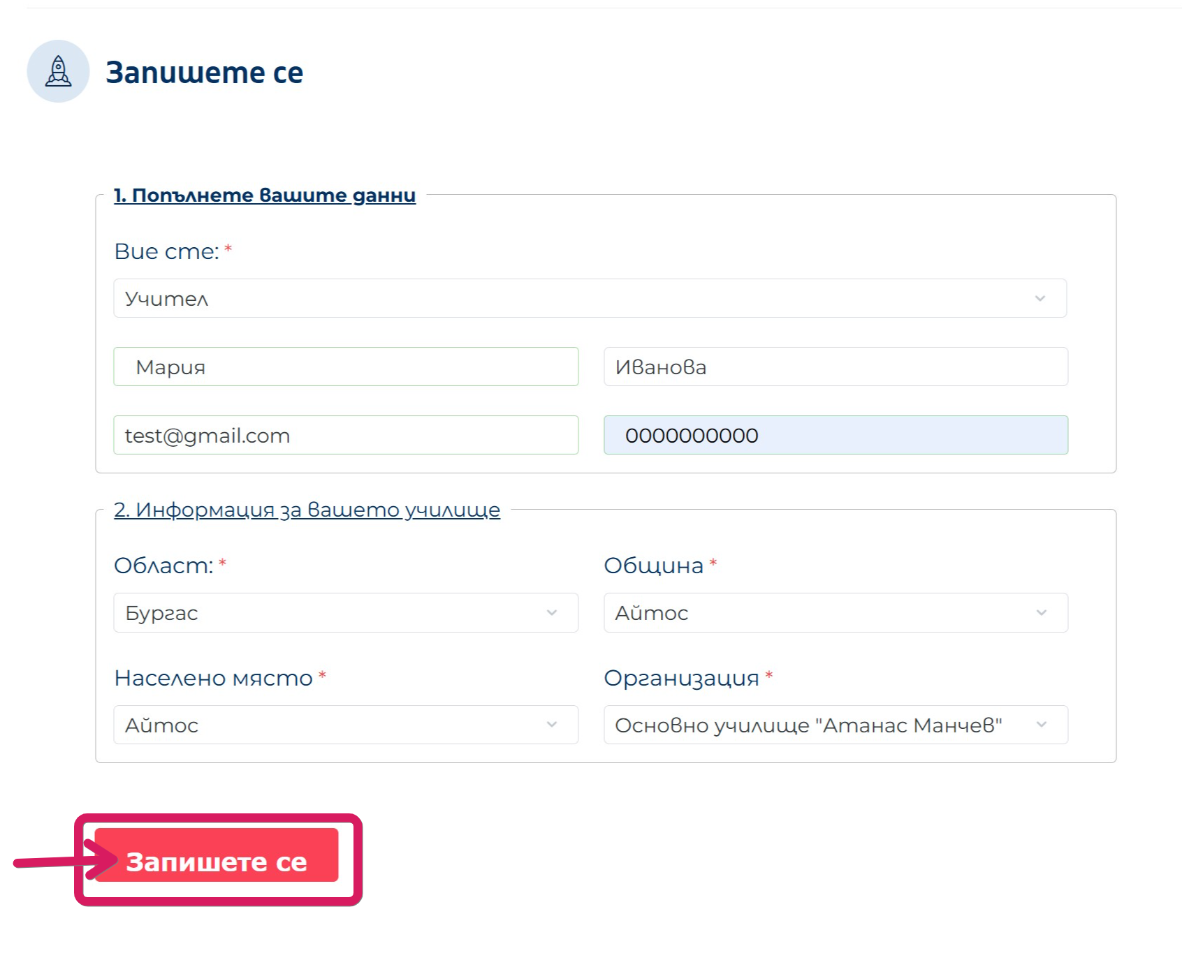 - Попълнете данните си и информация за училището си;