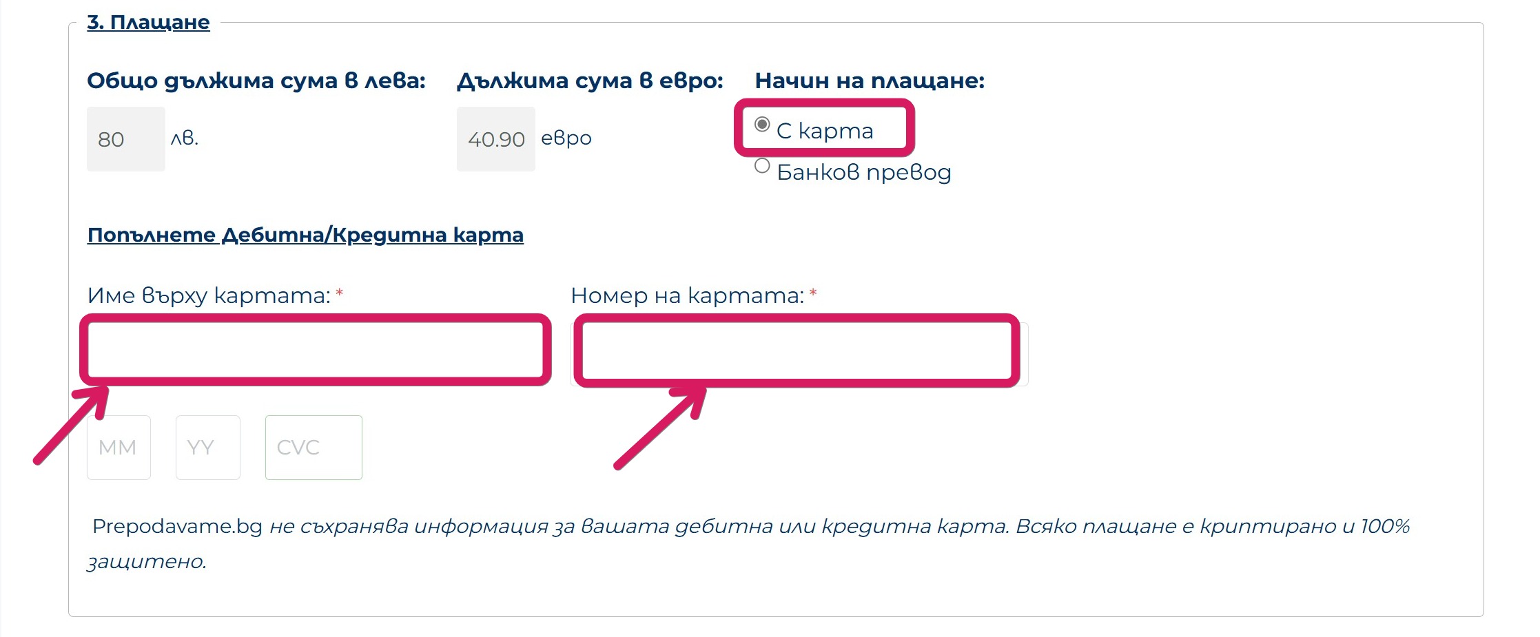 - Въведете имената, които са изписани на картата, с която извършвате плащането;