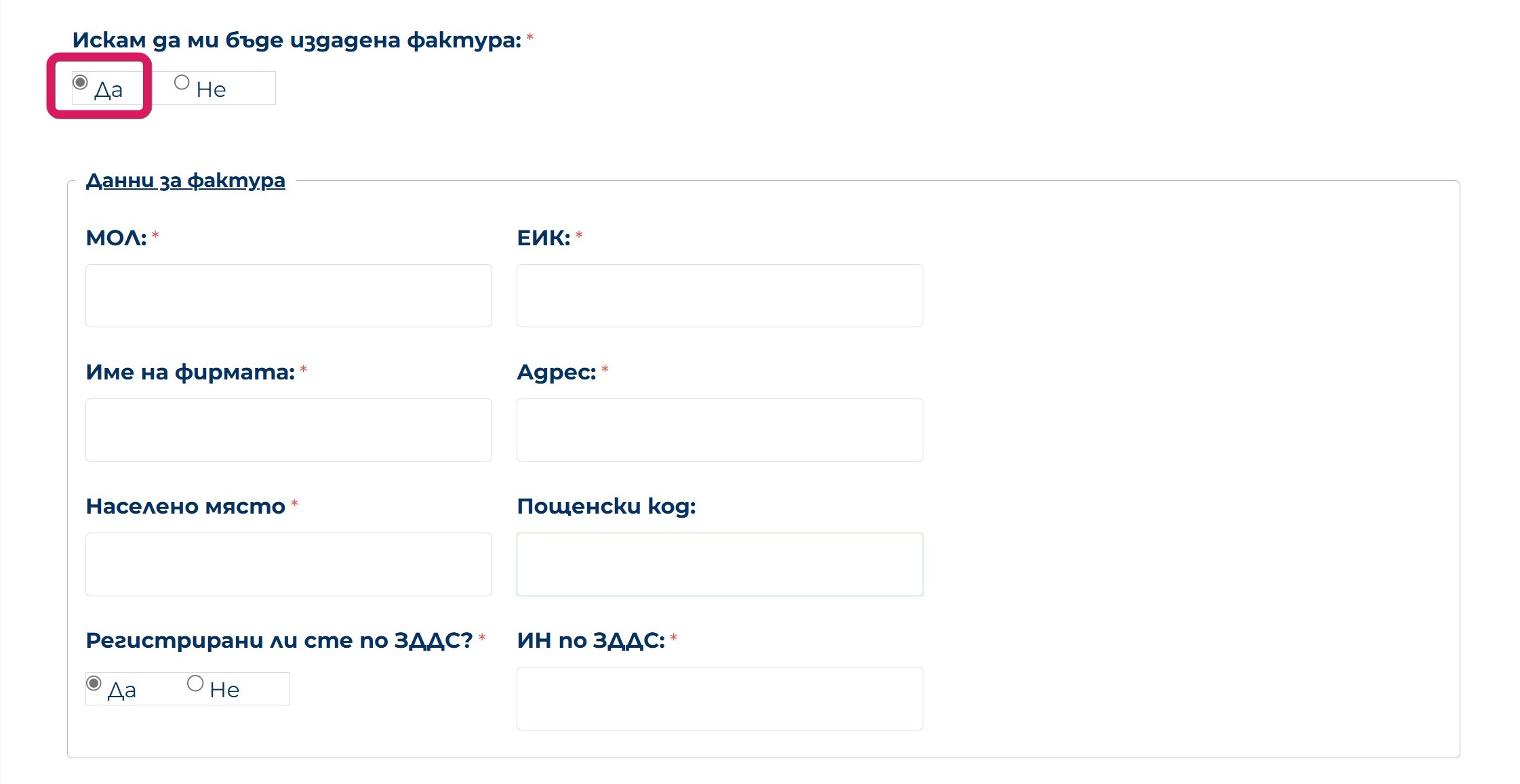 - Отбележете опцията за фактура и попълнете данните на организацията;