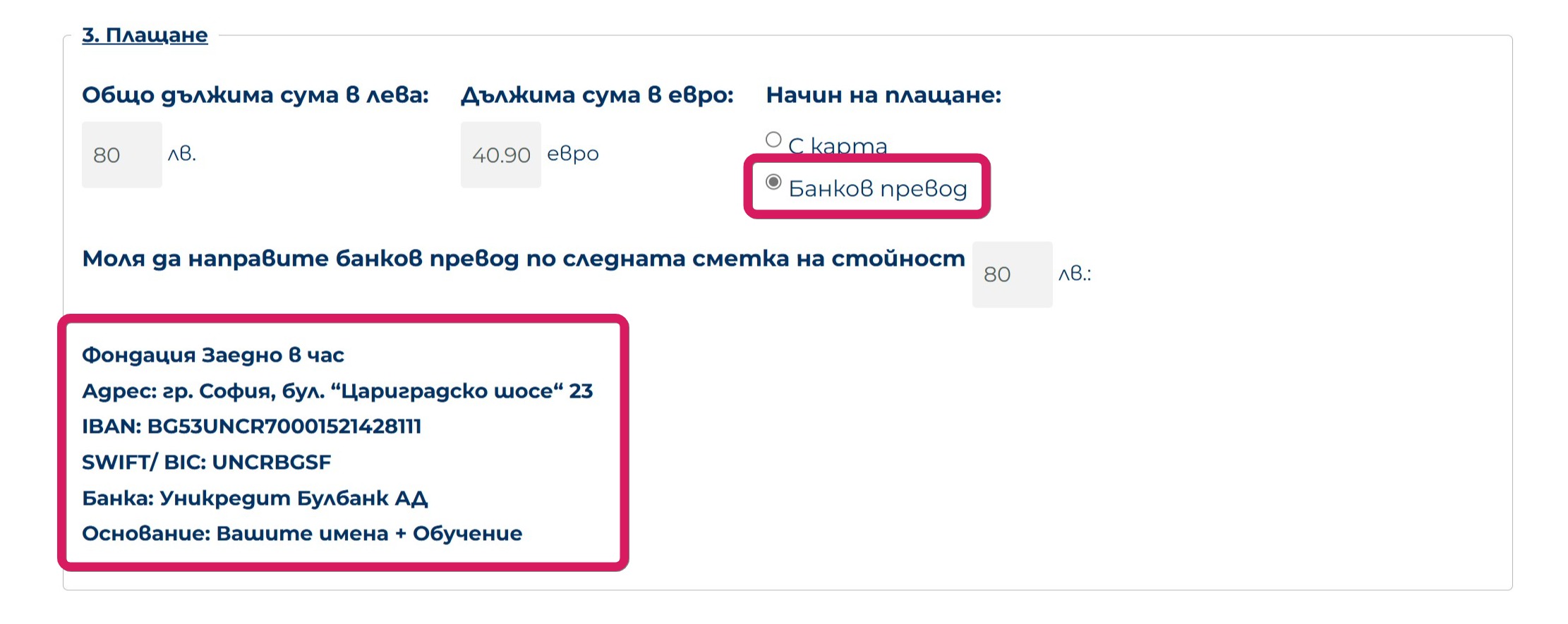 - Важно: напишете името си като основание за плащане;