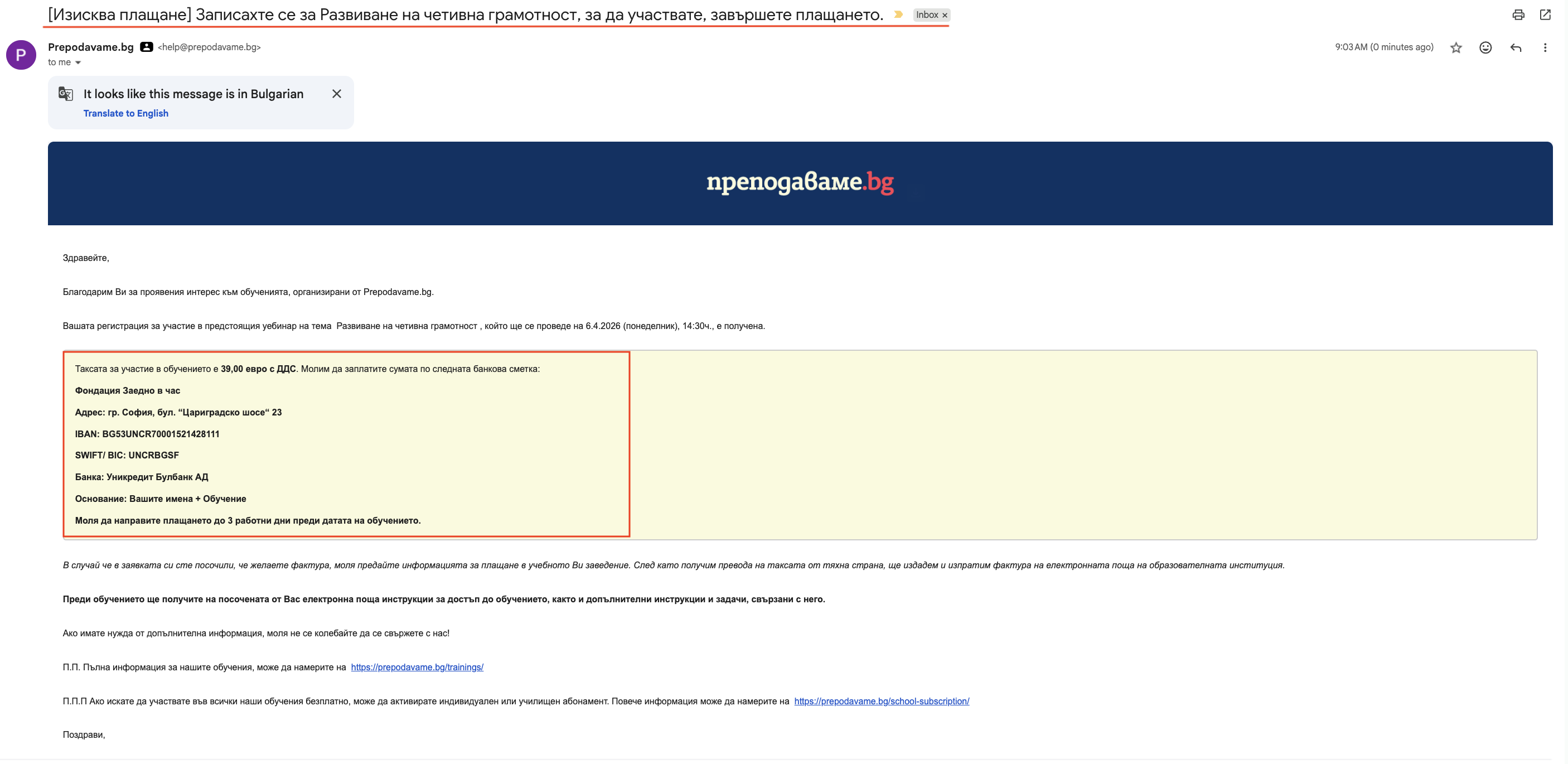 - Цена на обучение: 39 евро с ДДС