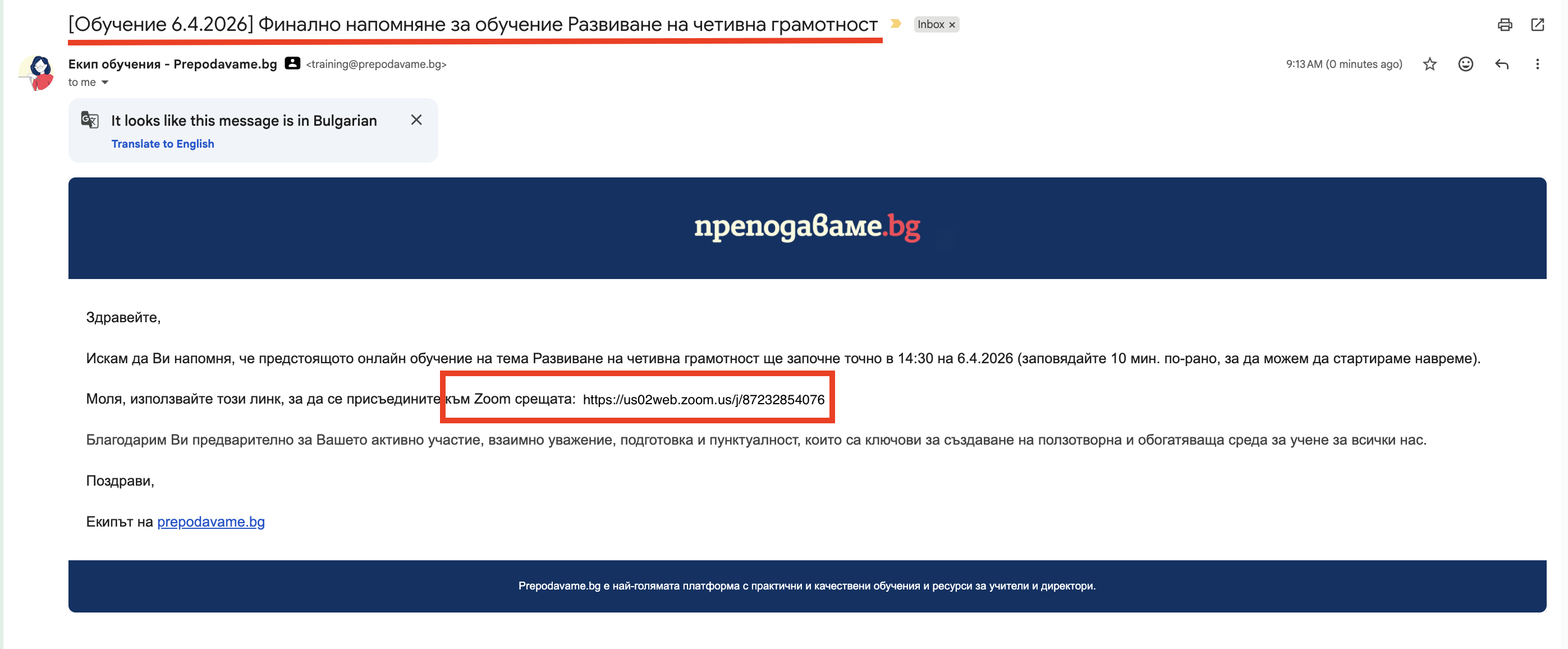 След успешното предаване на задачата, ще получите имейл с линк за включване в Zoom.
