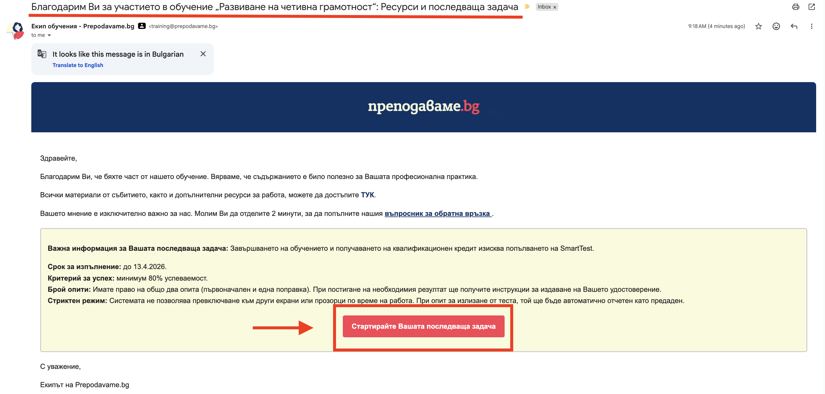 Ще получите имейл с материали от обучението, въпросник за обратна връзка и последваща задача.